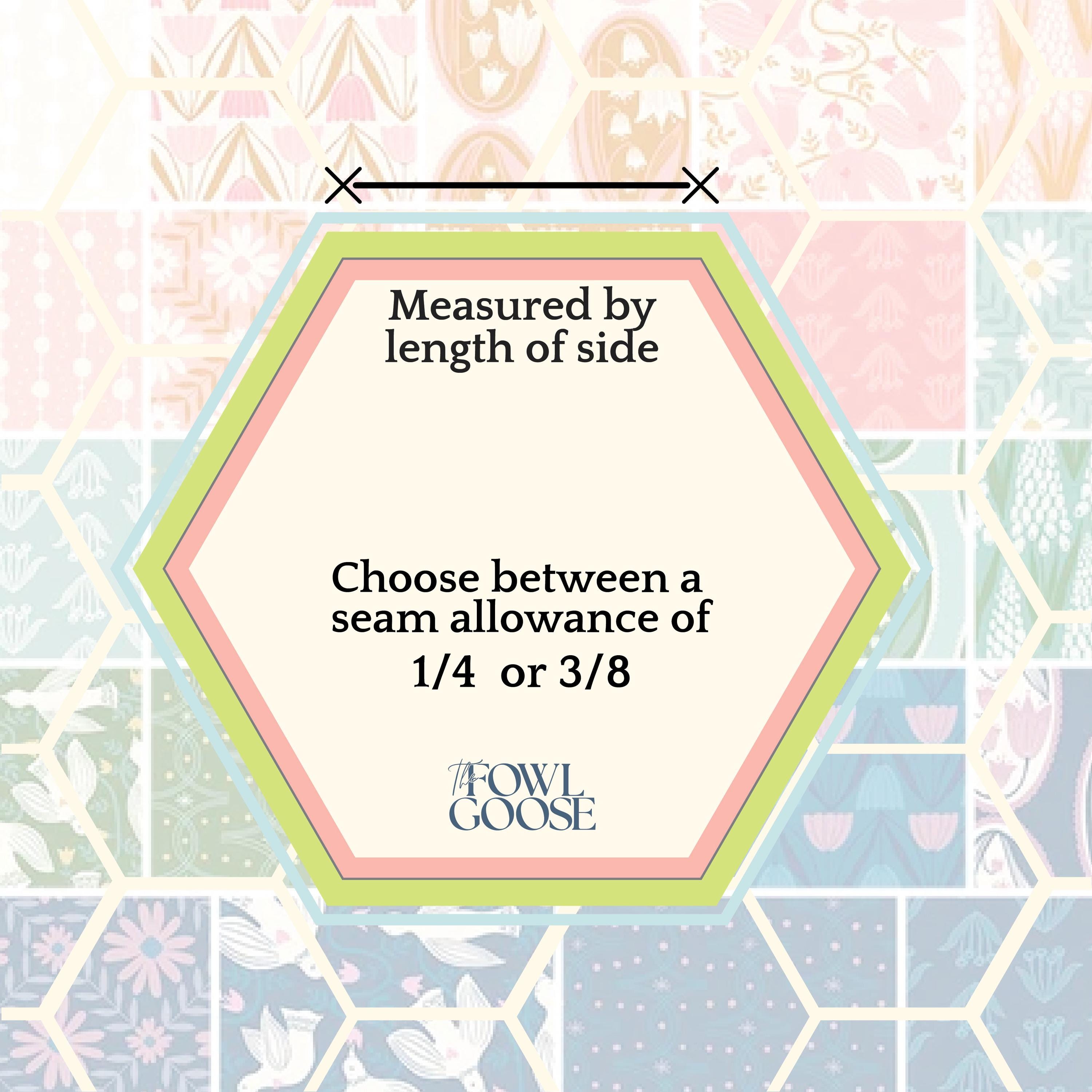 English Paper Piecing is a traditional quilting method using paper shapes to hand piece the fabric together. The papers are the finished size of the piece - these do require either glue or thread basting and fabric cuts to have included seam allowance. Instructions are not included - there is plenty of information out there that's better written than I could manage :)