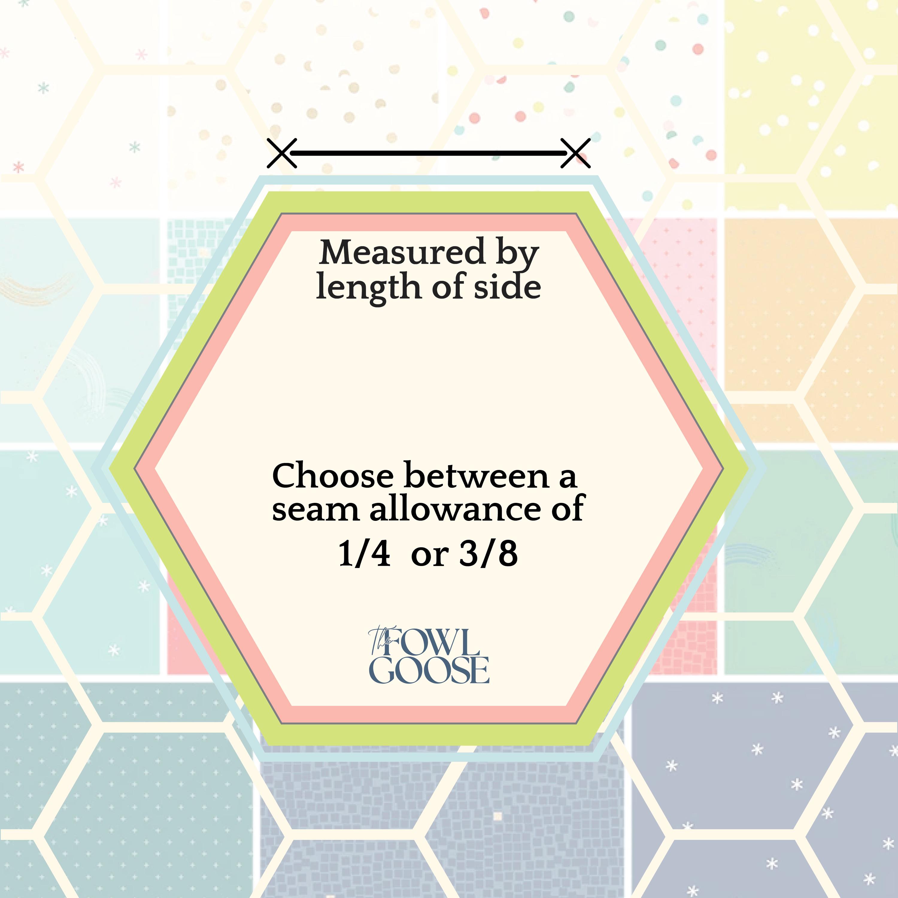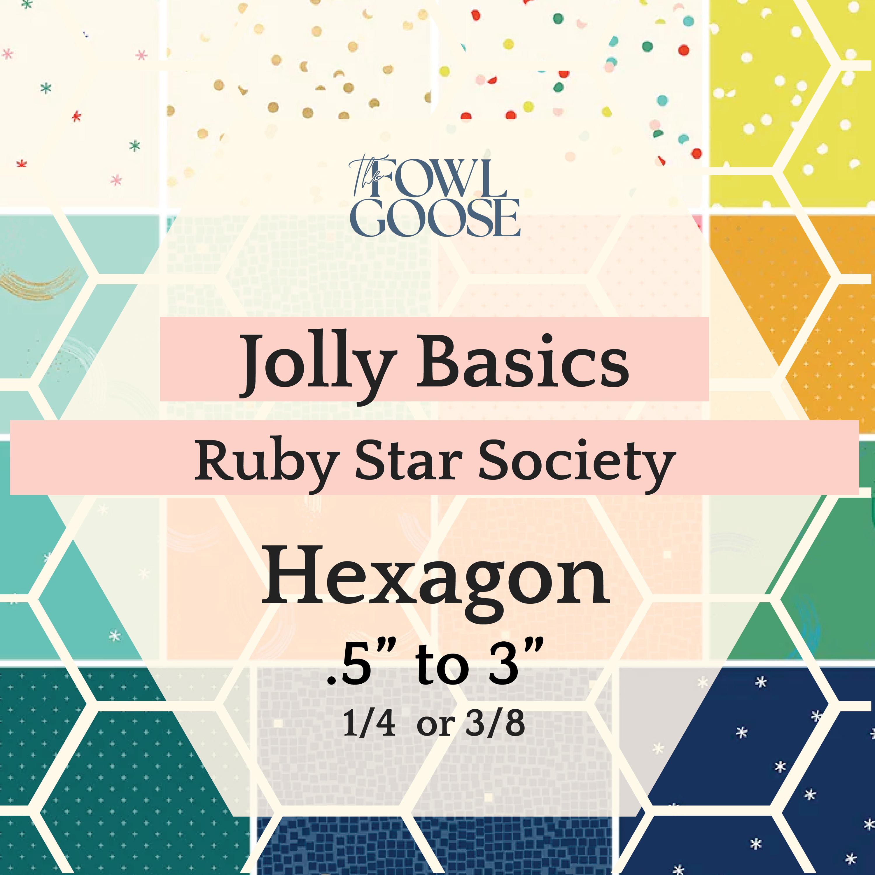 This listing is for a set of 50 hexagons from Ruby Star Society in Jolly Basics - either 1/4" (.25") or 3/8" (.375"). Prints pictured may not be included in your set.