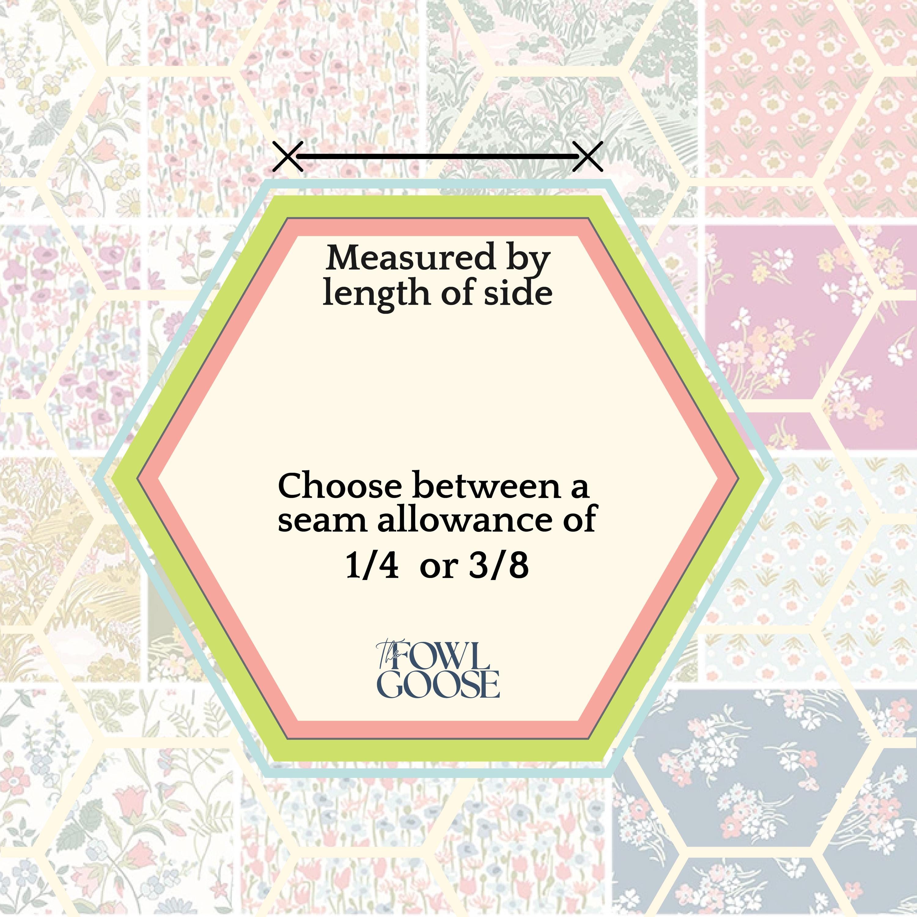 This listing is for a set of 50 hexagons from Liberty Fabrics in Botanist's Walk - either 1/4" (.25") or 3/8" (.375"). Prints pictured may not be included in your set.