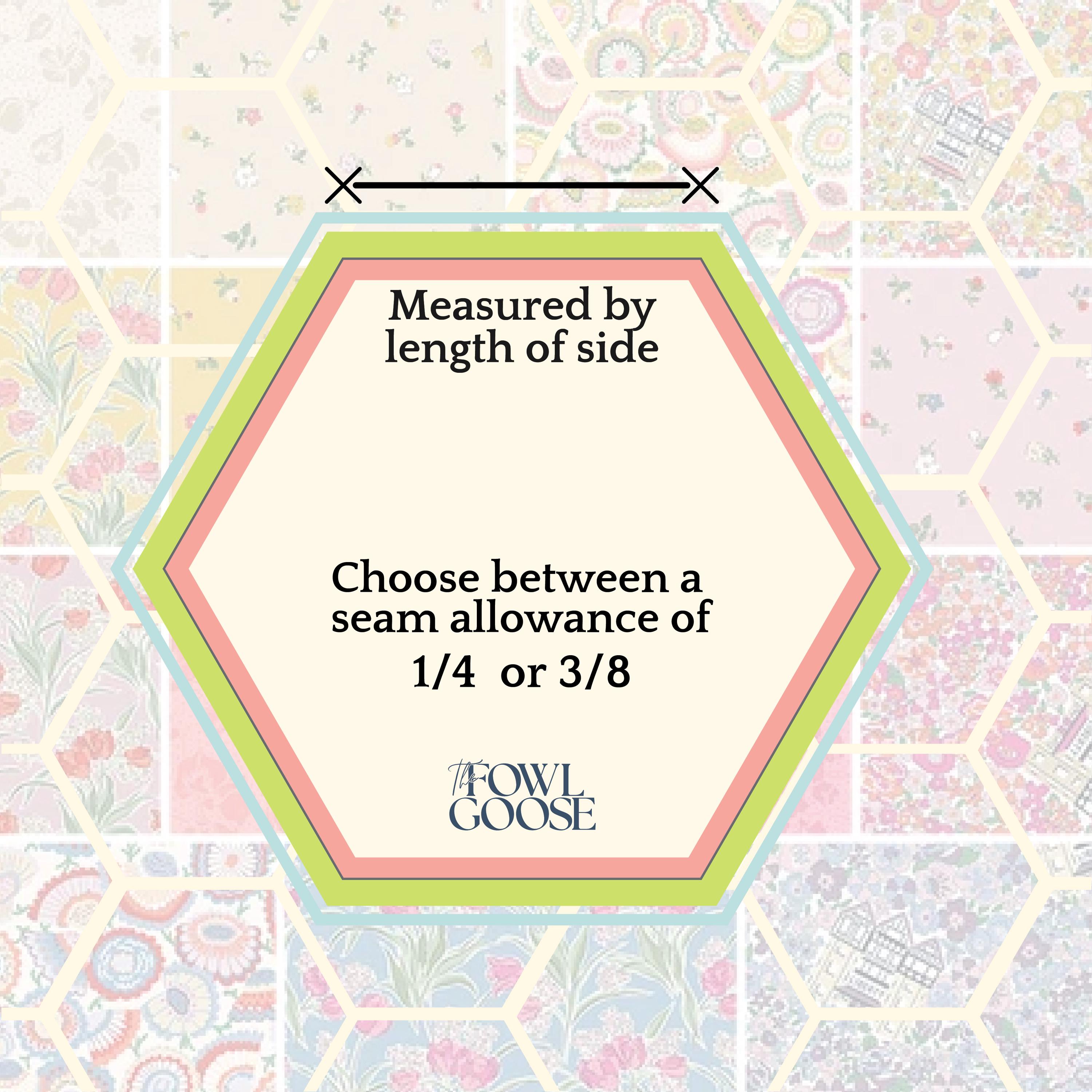 This listing is for a set of 50 hexagons from Liberty Fabrics in Liberty Flower Shop - either 1/4" (.25") or 3/8" (.375"). Prints pictured may not be included in your set.