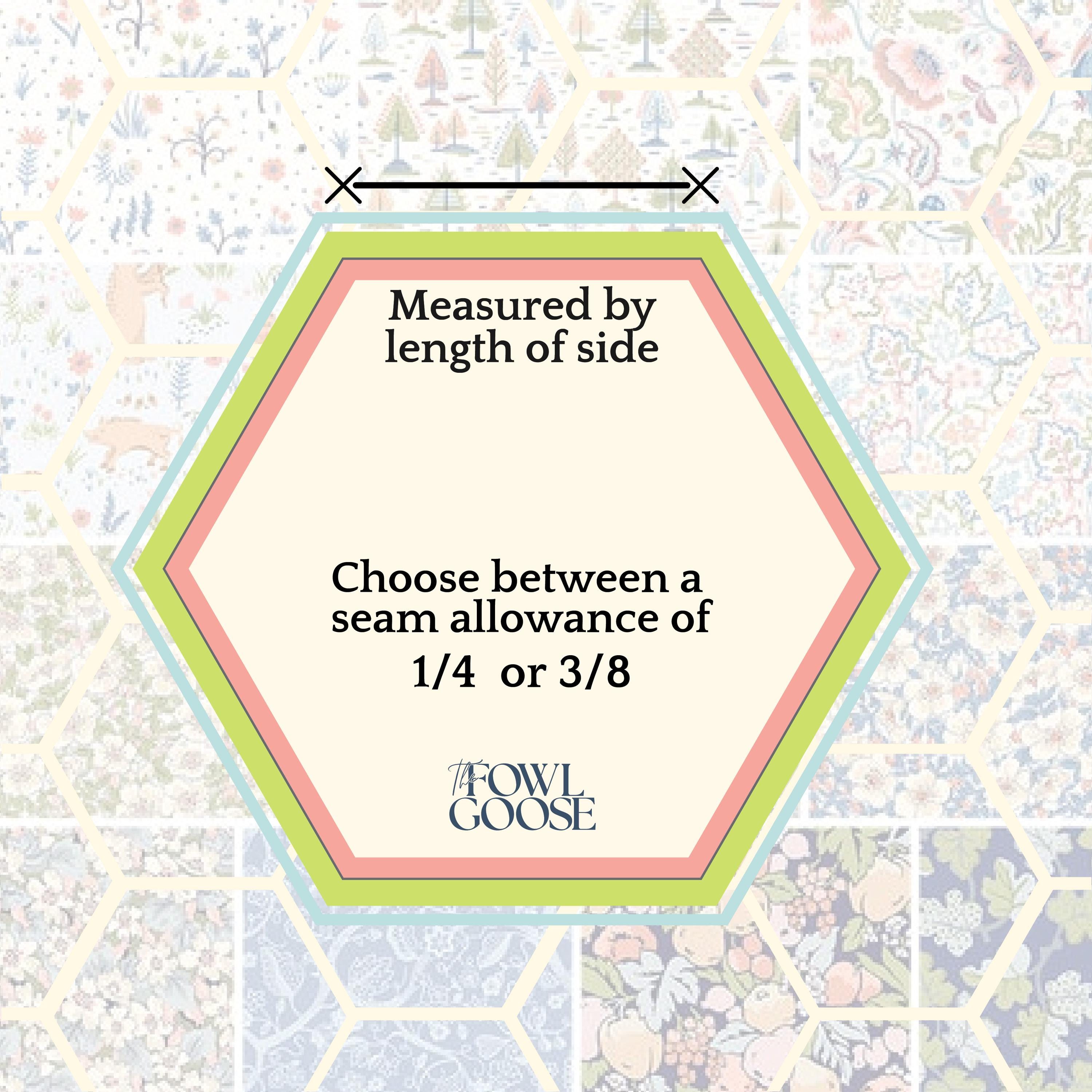 English Paper Piecing is a traditional quilting method using paper shapes to hand piece the fabric together. The papers are the finished size of the piece - these do require either glue or thread basting and fabric cuts to have included seam allowance. Instructions are not included - there is plenty of information out there that's better written than I could manage :)