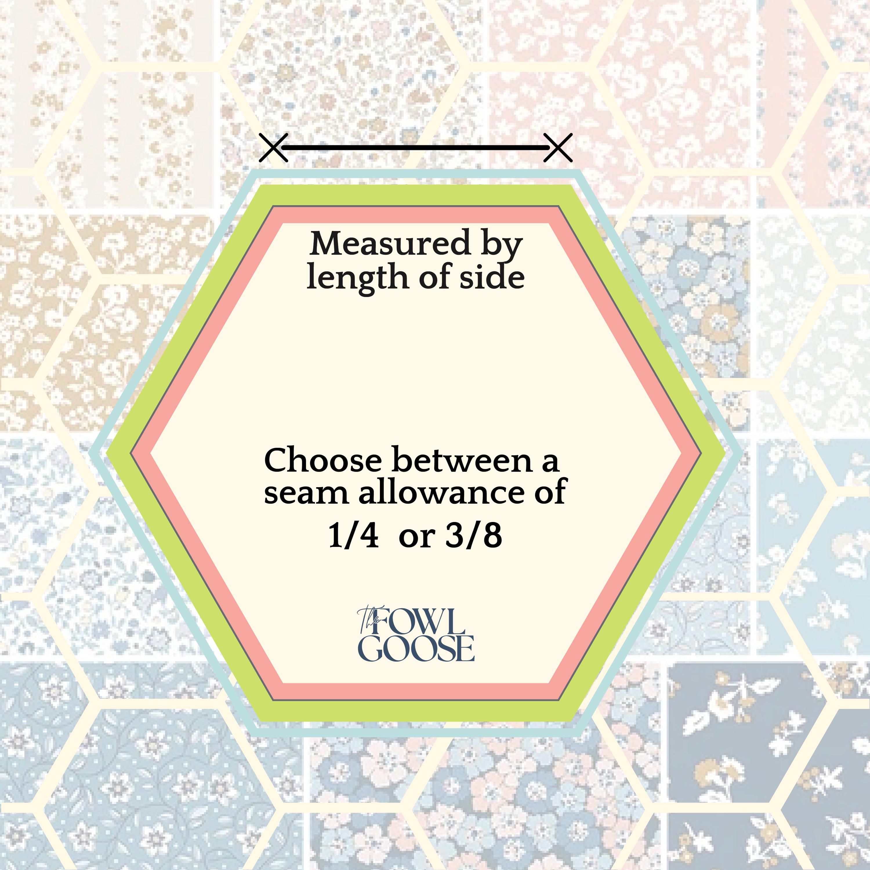 This listing is for a set of 50 hexagons from Liberty Fabrics in Denim Florals - either 1/4" (.25") or 3/8" (.375"). Prints pictured may not be included in your set.