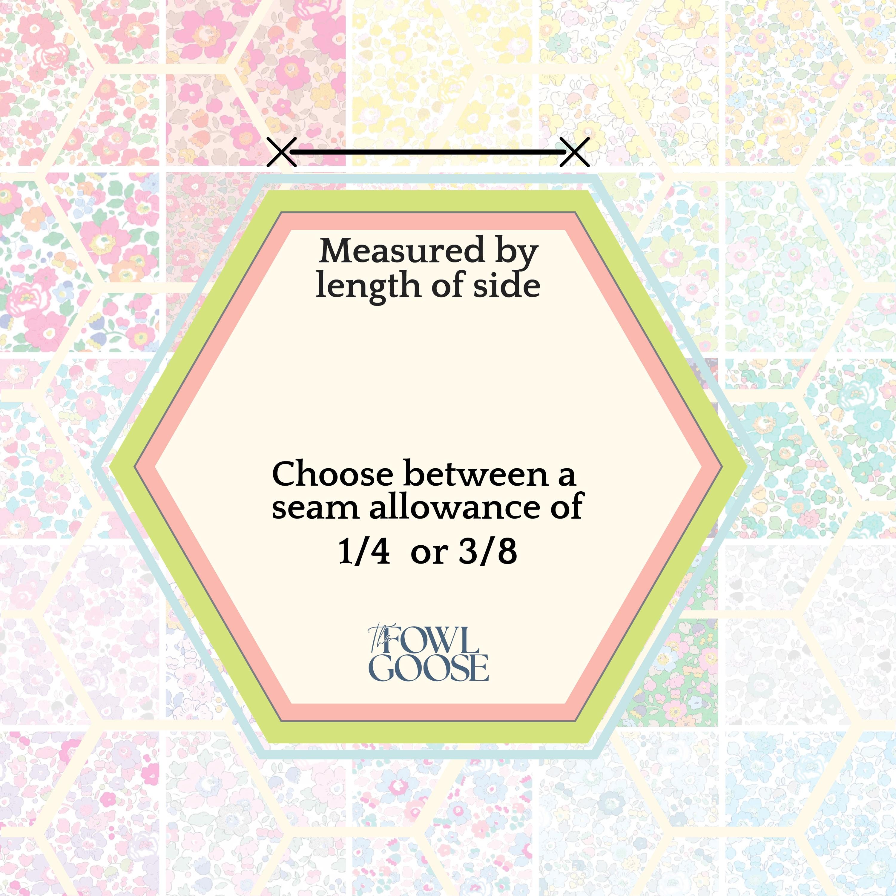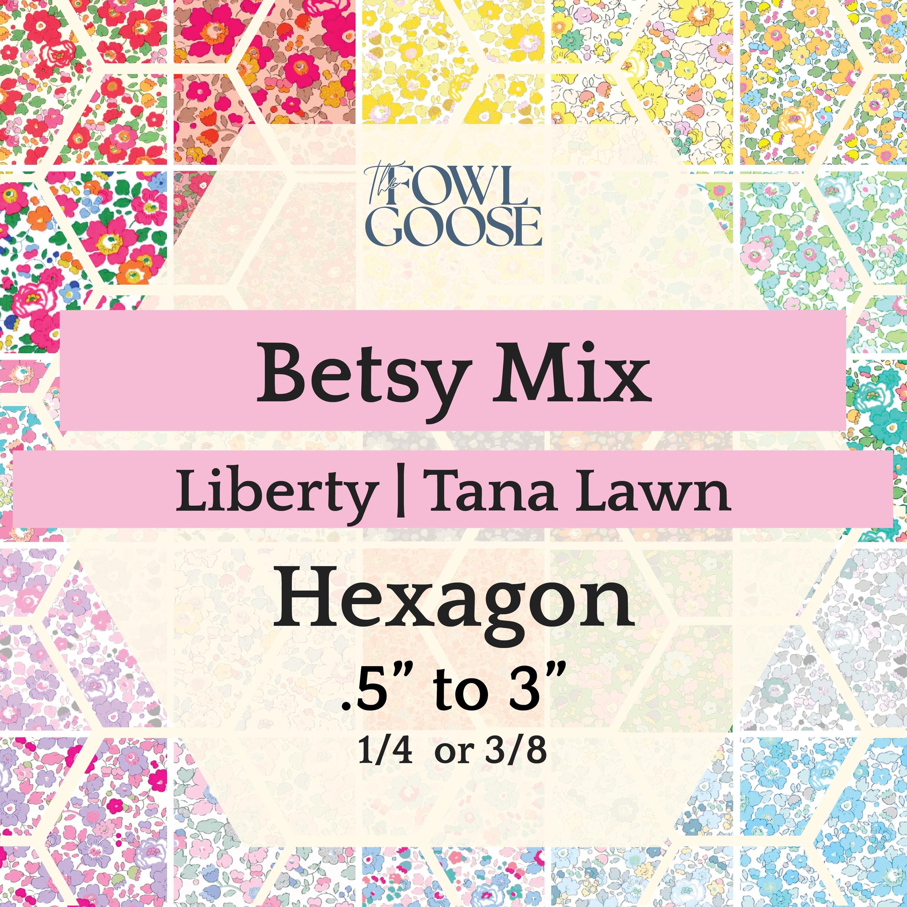 This listing is for a random selection of Liberty Tana Lawn Cotton hexagons in Betsy - either 1/4" (.25") or 3/8" (.375"). Prints pictured may not be included in your set.