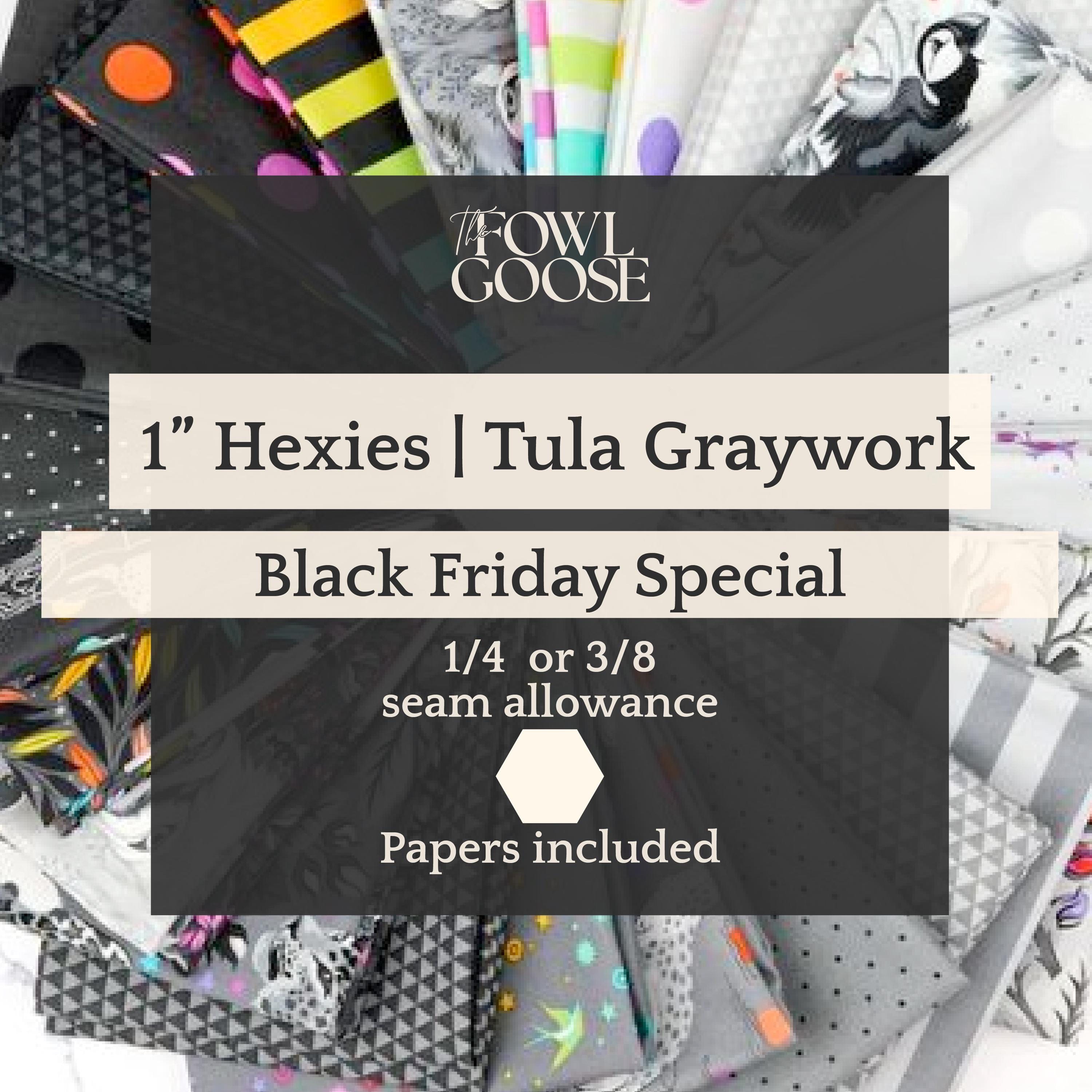 This listing is for a set of 50 hexagons in Tula Pink Graywork - either 1/4" (.25") or 3/8" (.375"). Colors are randomly selected.