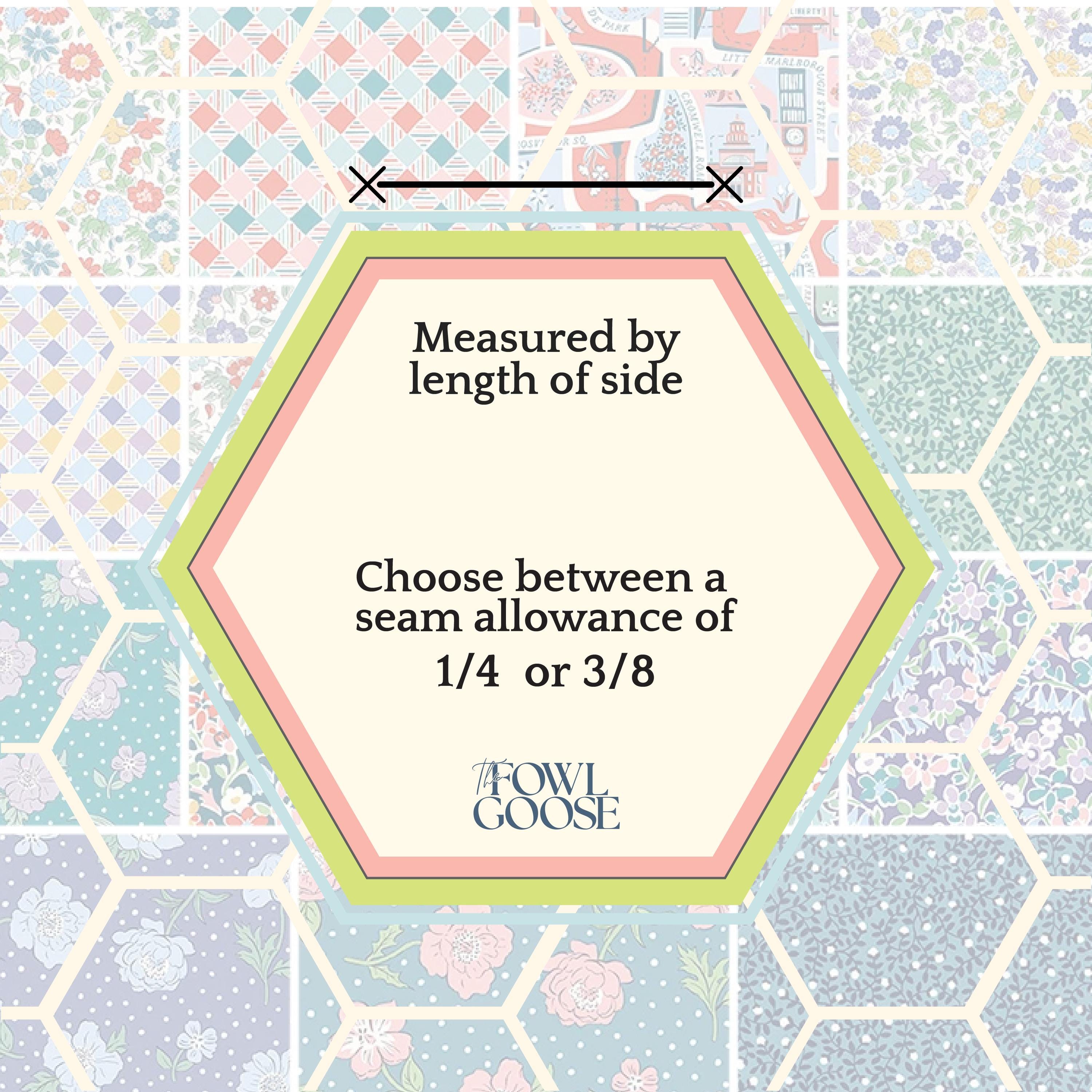 This listing is for a set of 50 hexagons from Liberty Fabrics in London Bouquet - either 1/4" (.25") or 3/8" (.375"). Prints pictured may not be included in your set.