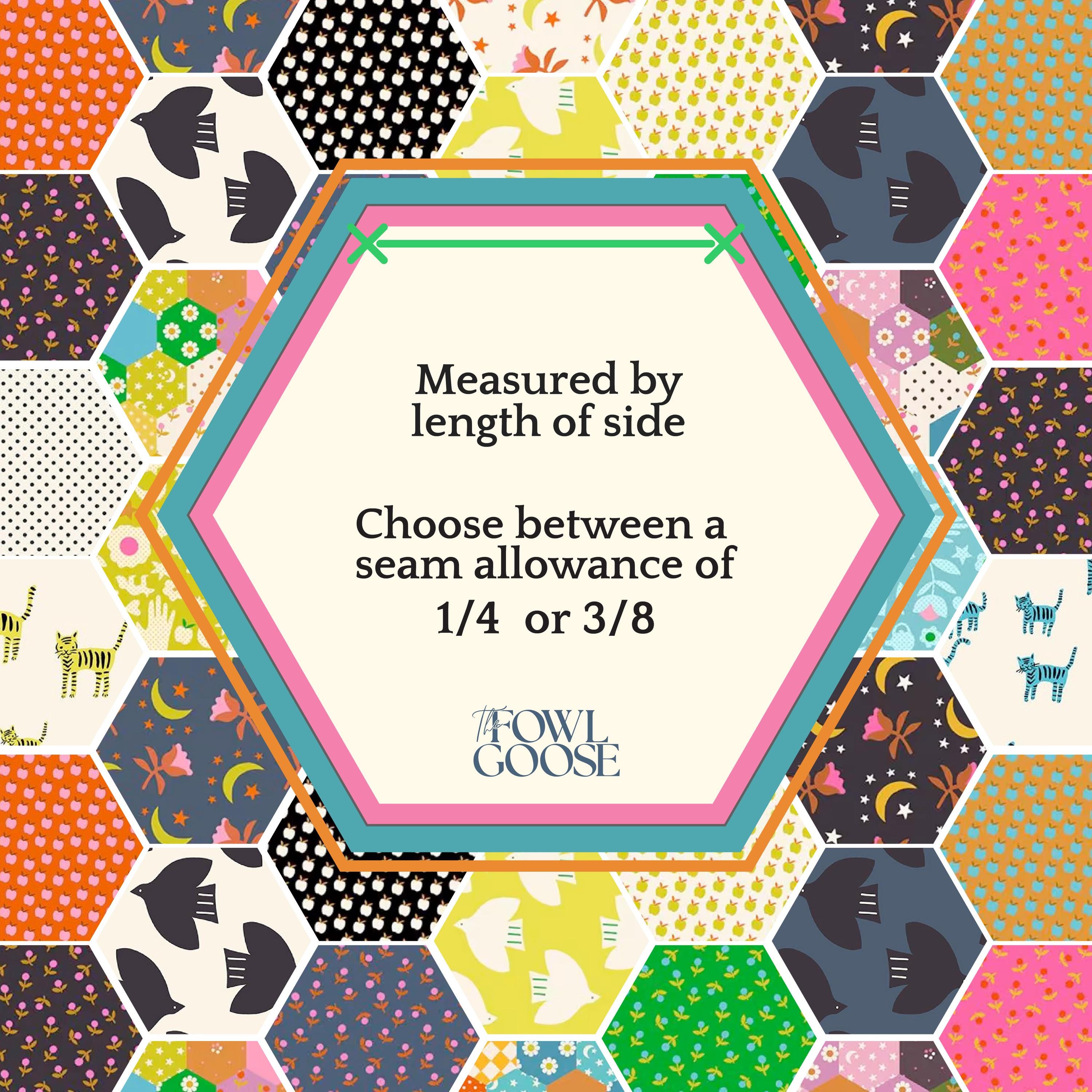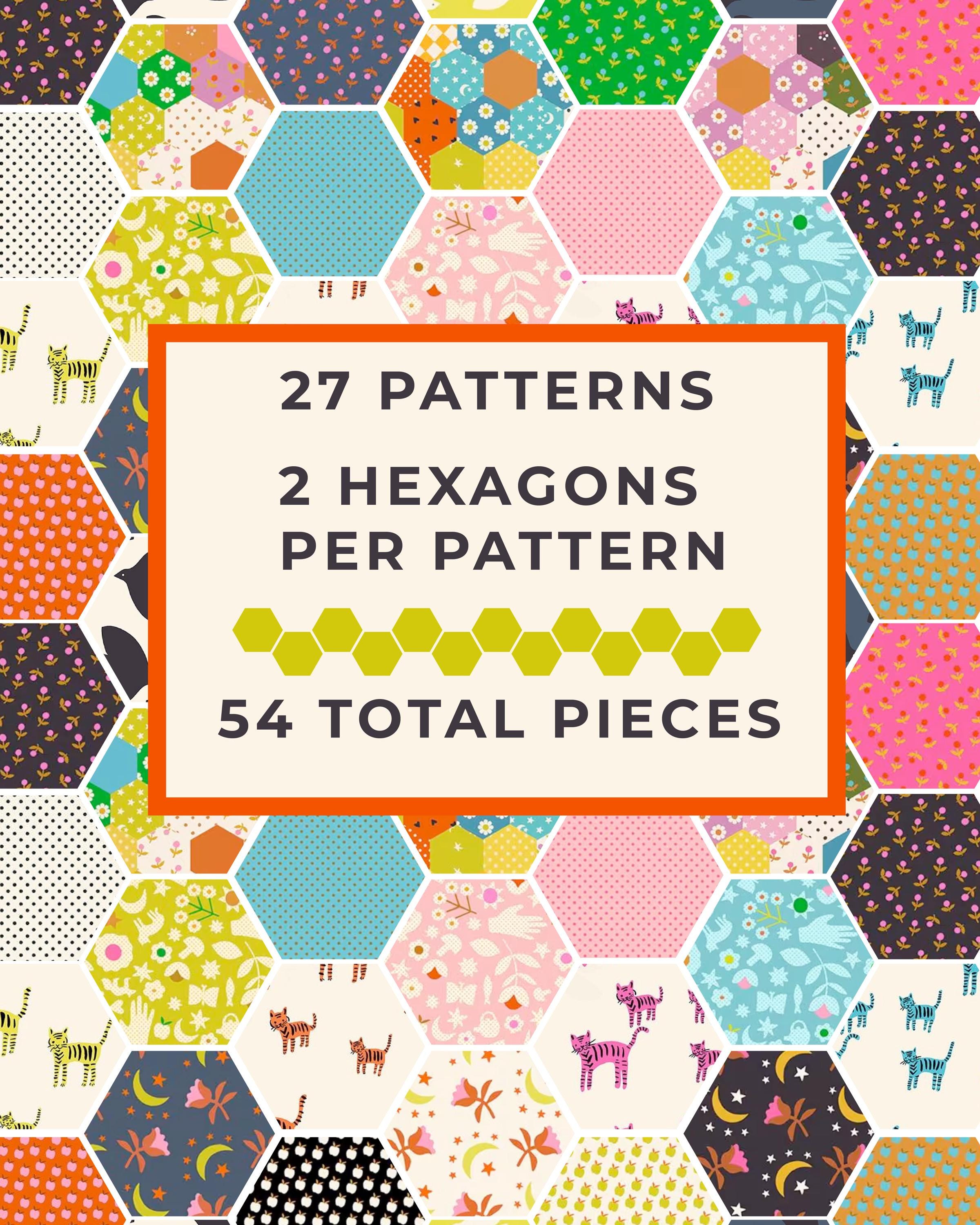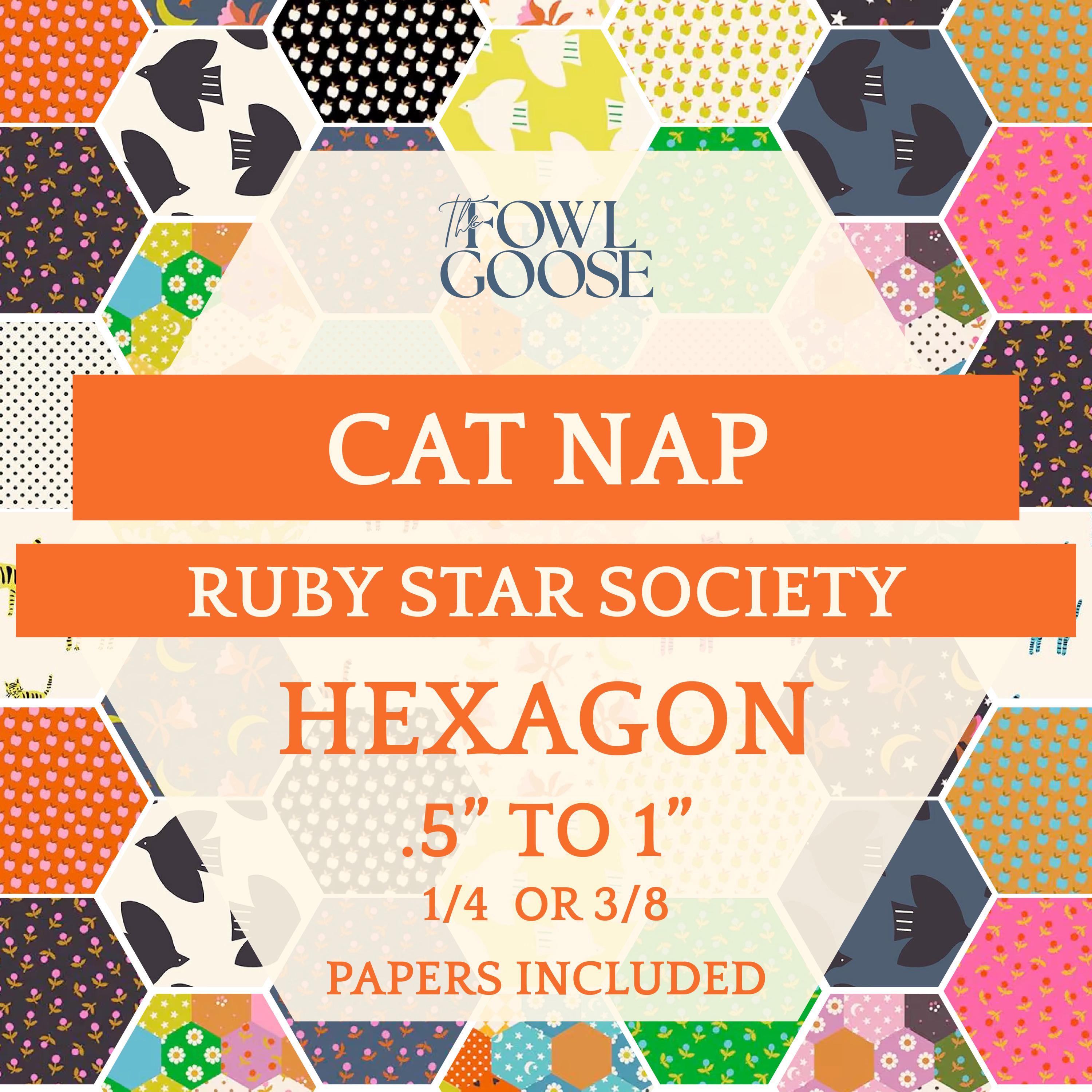 This listing is for a set of 54 hexagons from Ruby Star Society in Catnap - either 1/4" (.25") or 3/8" (.375"). You will receive 2 hexagons of each pattern.