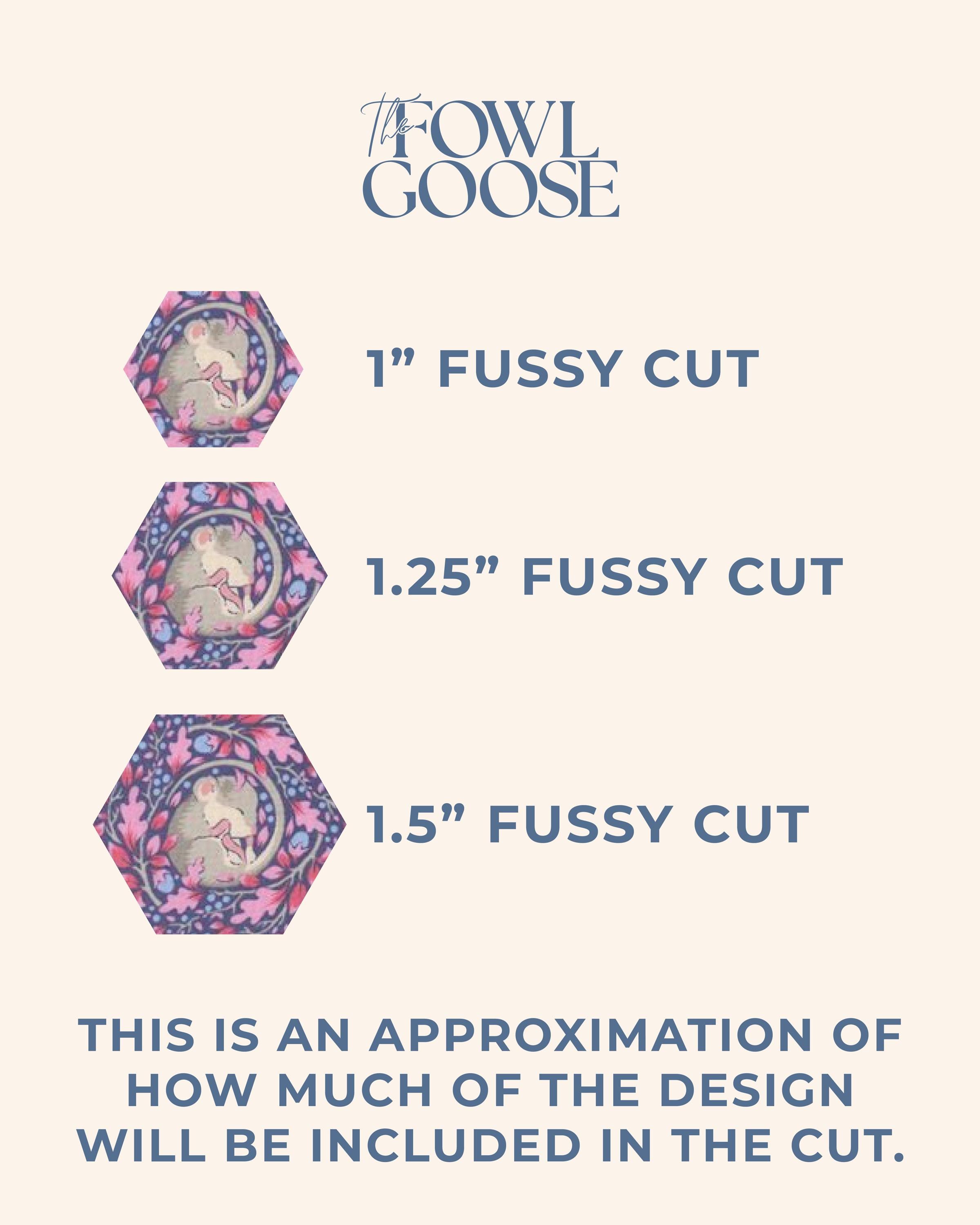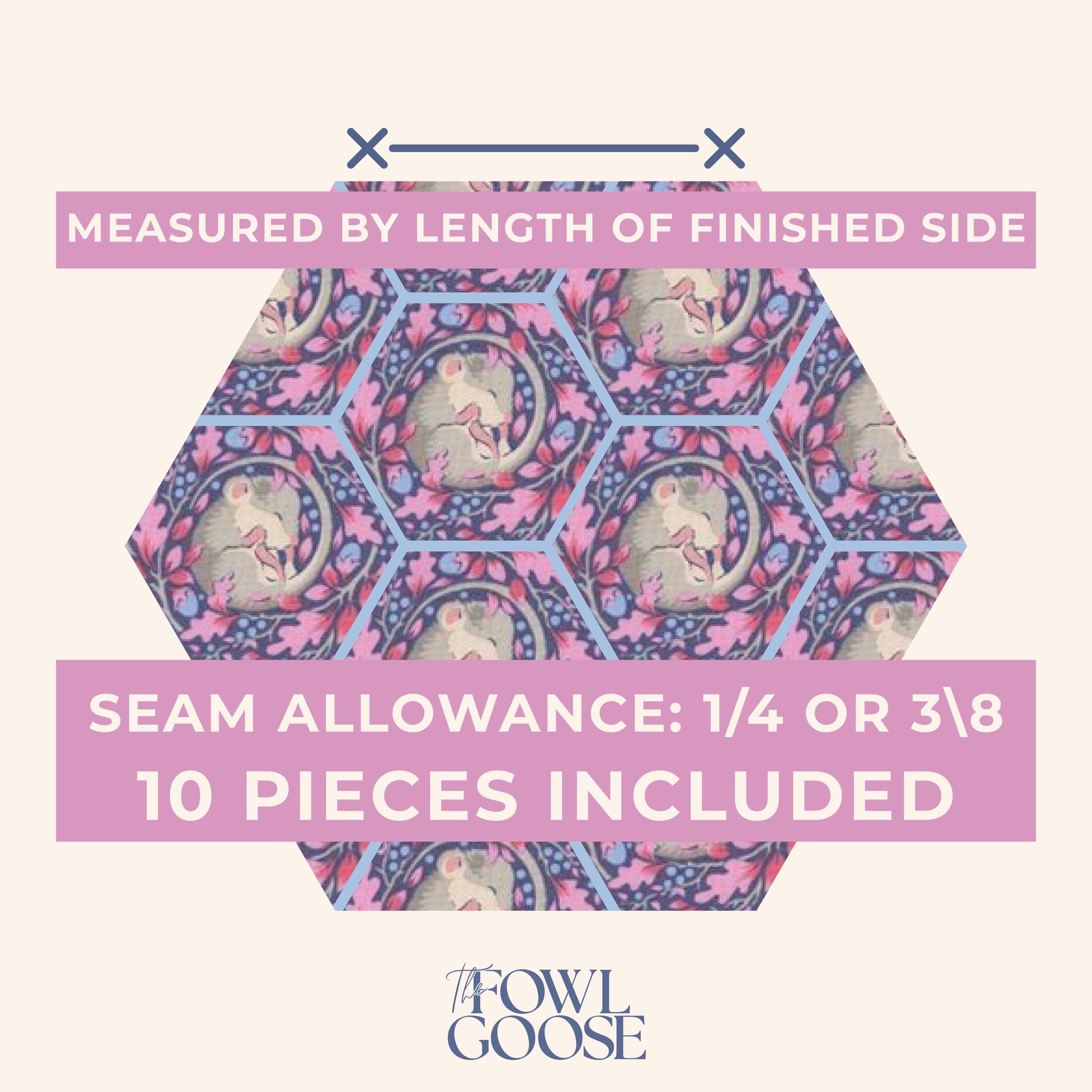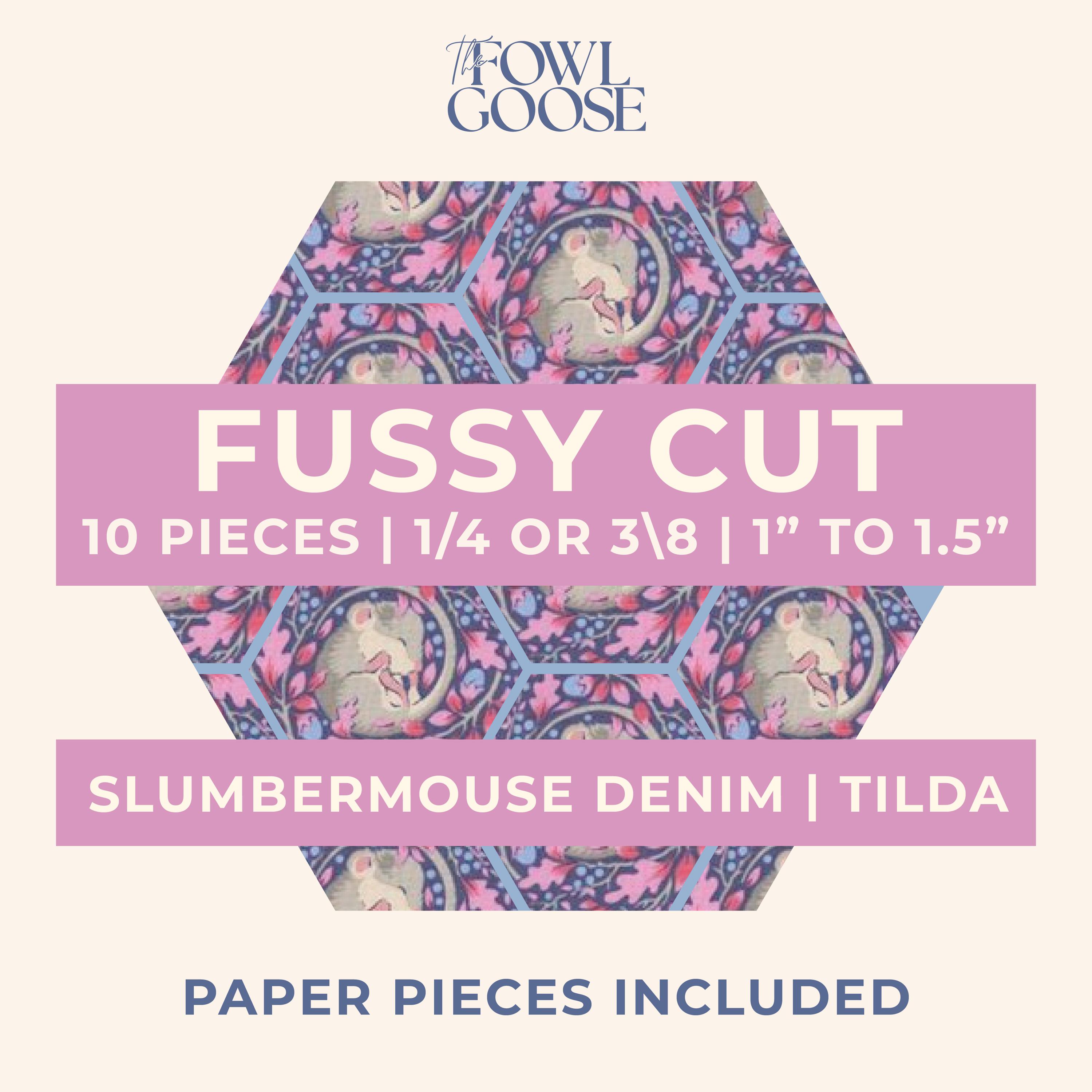 This listing is for a set of 10 fussy cut hexagons from Tilda Fabrics in Hibernation Slumber Mouse Denim - either 1/4" (.25") or 3/8" (.375").