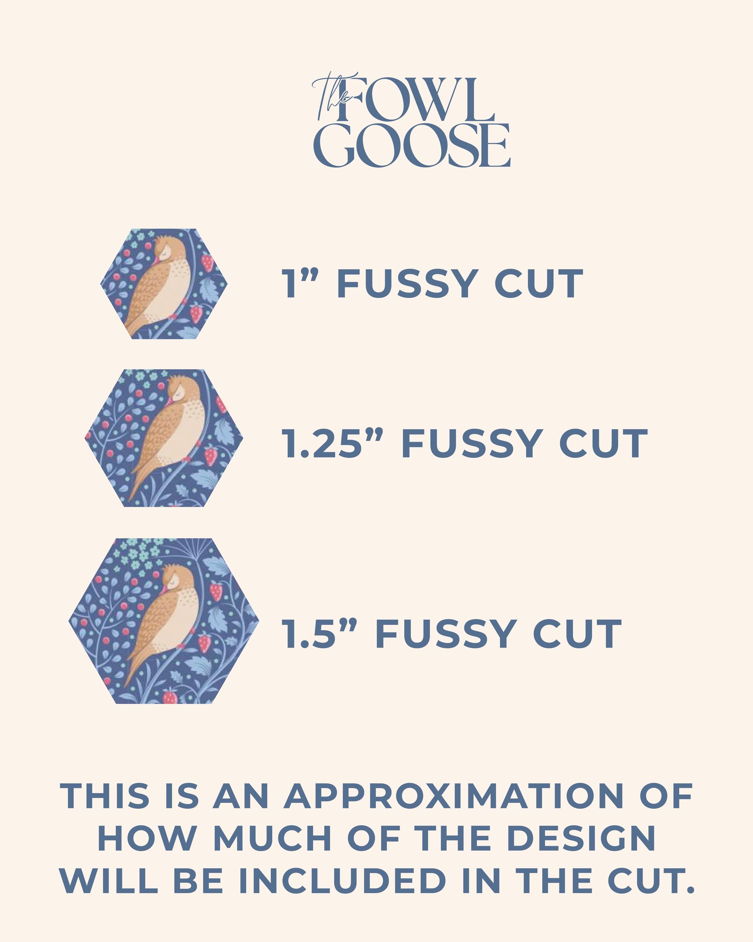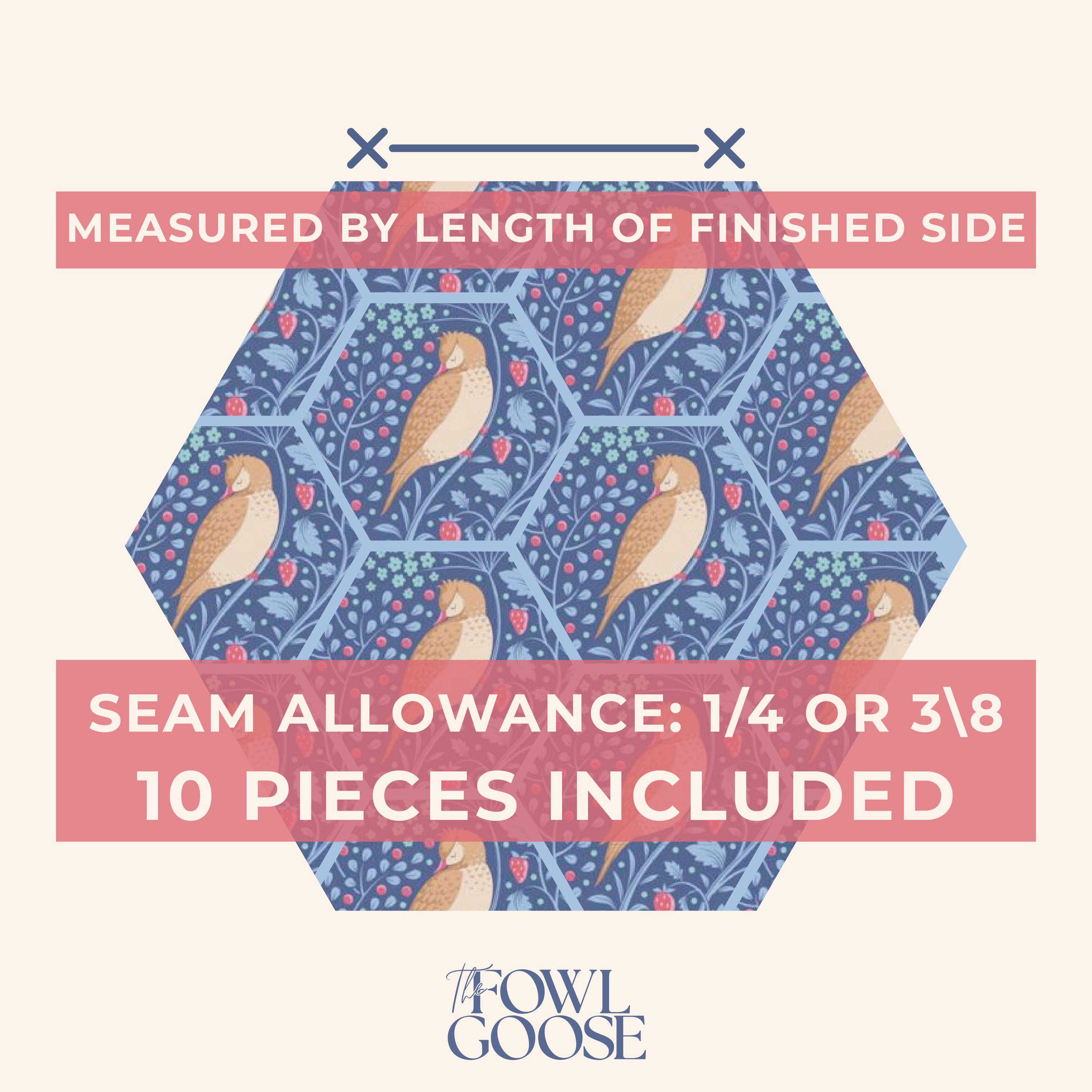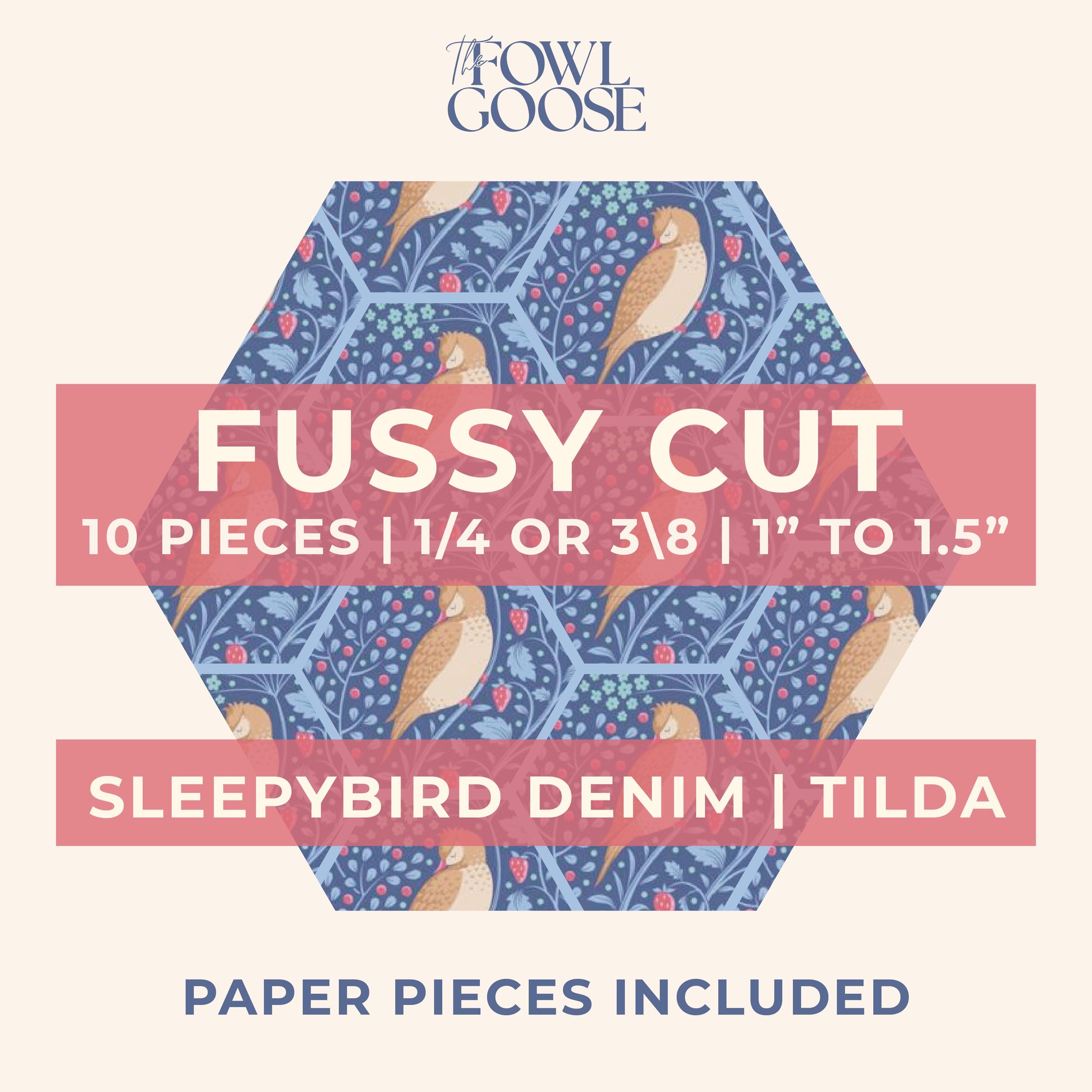 This listing is for a set of 10 fussy cut hexagons from Tilda Fabrics in Hibernation Sleepy Bird Denim - either 1/4" (.25") or 3/8" (.375").